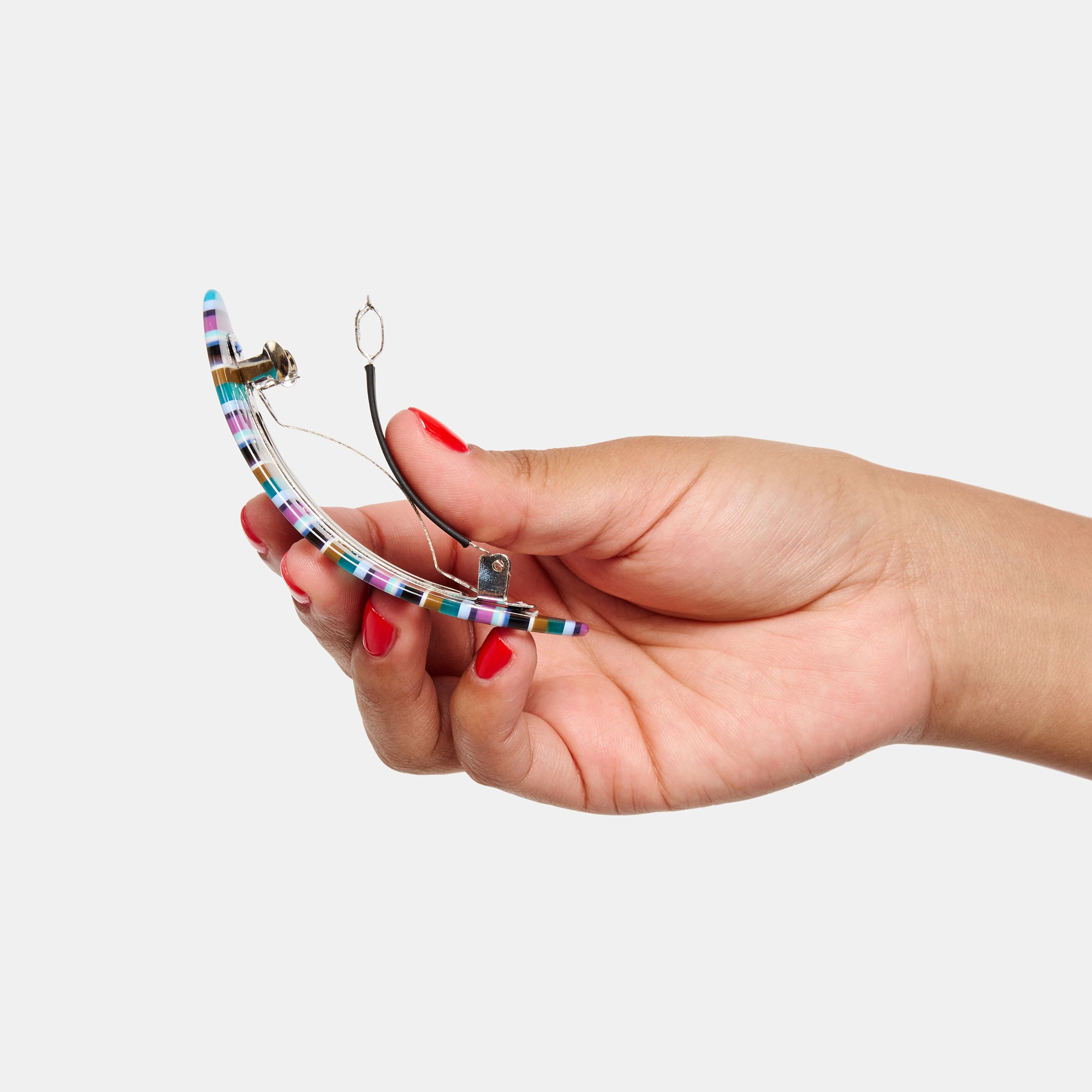 A classic oval shaped barrette in a bold stripe pattern. The curved french clip style is perfect for half holds on all types of hair.